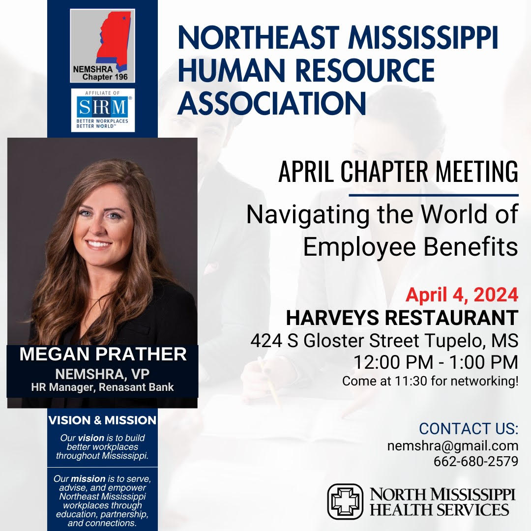 | Location: | Harveys Restaurant: 424 South Gloster St. Tupelo, MS. OPTIONS: Please arrive by 11:30a to get your food ordered and network! Lunch/Networking @ 11:30a Speaker/Meeting @ 12:00 – 1:00p NEMSHRA 196 is inviting you to a scheduled Zoom meeting. Join Zoom Meeting https://us02web.zoom.us/j/81383242137?pwd=S2pqU0l5bVJaNkxMWE91SllTOWd2QT09 Meeting ID: 813 8324 2137 Passcode: 749511 |